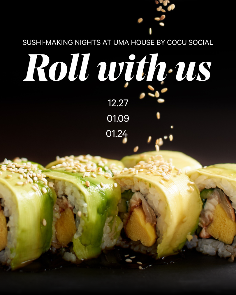 Vem enrolar com a gente. Noites de sushi, do jeitinho Uma. Em colaboração com a CocuSocial Datas selecionadas, vagas limitadas. Use o código UMA10 para 10% de desconto na finalização da compra. Reserve seu avental em cocusocial.com